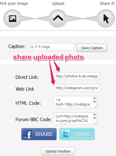 Step 5: When the photo will be uploaded, it will provide a direct link, a web link, and HTML code for your uploaded image. You can share the link with your friends to let them see your uploaded photo. You can also open the web app of Instagram to see the uploaded photo.