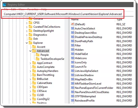 Once the Registry opens, go this key: HKEY_CURRENT_USER\Software\Microsoft\Windows\CurrentVersion\Explorer\Advanced