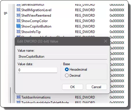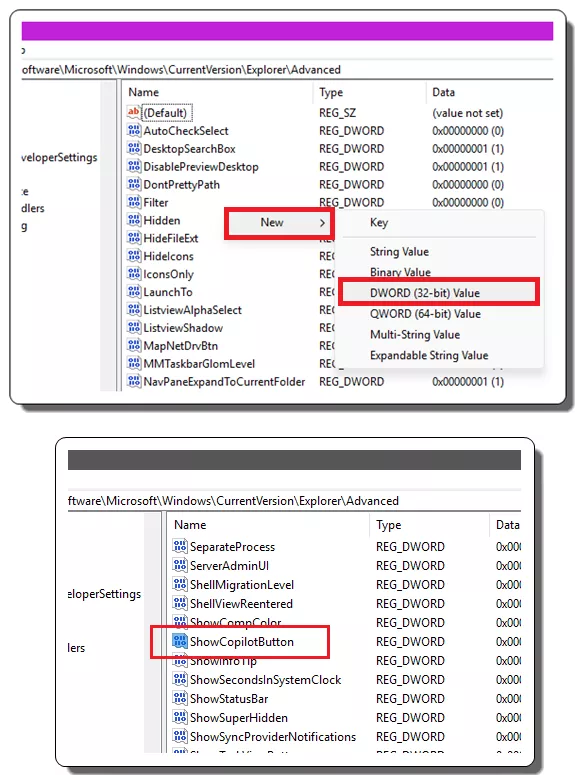 Right click in empty area and create a new 32-bit DWORD and name it “ShowCopilotButton”. For reference, see the screenshot below.
