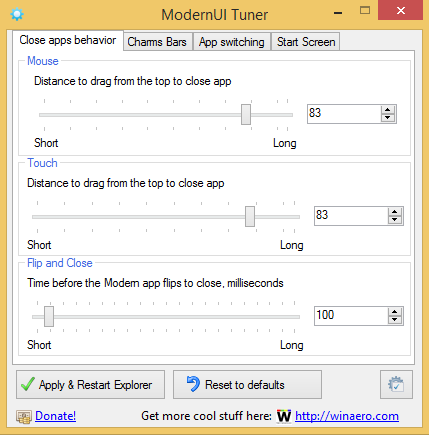 - Flip and Close: In Windows 8.1, the method of closing a Metro app has changed. Although the Alt+F4 shortcut works fine, if you want to close your app, you need to drag it to the very bottom and keep it held there for a few seconds till the app’s thumbnail flips and then the app closes. The delay in flipping of the app’s thumbnail may be an annoyance to many and this section Flip and Close allows you to tweak the delay you have to wait through before the app actually closes.