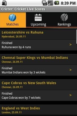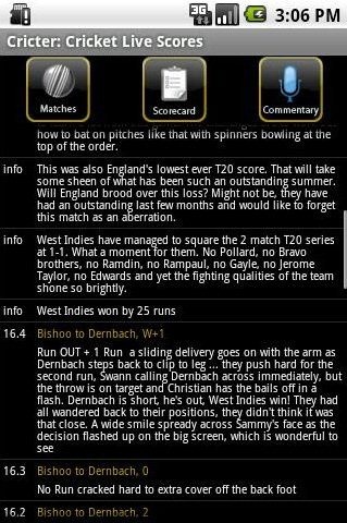 Cricter Android app also provides you the information about upcoming matches. There is a column in the android app which tells you the upcoming match schedule with the team names between whom the matches will be played. The only thing which you need to keep in mind is that you should have an internet connection (2G, 3G or Wi-Fi). It also provides you with Ball to Ball Commentary in a column in the app.