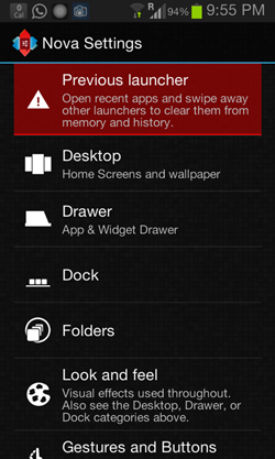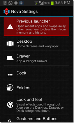 - Once you click Nova Settings, you will get into the following screen from where you can control various actions of the Nova Launcher. You can control the Desktop settings, Drawer settings, Dock settings, Folders settings, Look and Feel settings, Gestures settings etc.