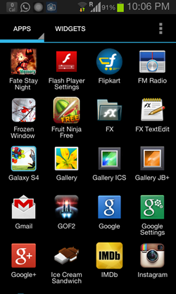 - When you click the applications button on the home screen, the apps list flies out from toward you to inside the device, making the animation effect look extremely beautiful. This animation effect reverses, and the app list flies toward you when you click the back button on your android device. The following screenshot illustrates the application list that opens up on clicking the app button on the home screen.