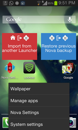 - You can click on the settings button on your Android device to fire up the menu below. You can get into your Android system settings, Nova settings or manage apps, or change the wallpaper.