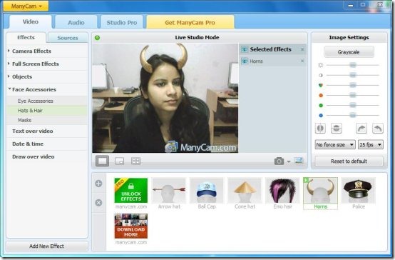 ManyCam allows you to add both still and animated backgrounds to your webcam feed. You can add pictures, graphics, animations, or some pre-recorded videos. Apart from that, it provides a bunch of amazing graphics and special effects that you can add to the background to make it even more funny, or interesting. These effects include camera distortion and filters, background effects, border and overlay effects, funny objects, face accessories, masks, etc. You can also add amazing CGI graphics like water and fire effects and display current date and time on your chat window.