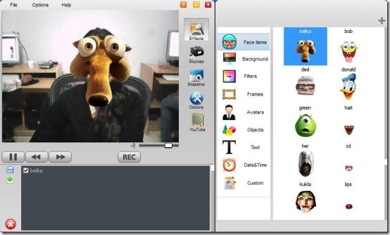 SplitCam is another free software that lets you add funny webcam effects to your video chat. It provides a bunch of free webcam effects including face items, filters, backgrounds, frames, avatars, flags, objects, and customized text. SplitCam also provides some amazing 3D masks that lets you add funky animal faces and other 3D objects on your face that follows your face movements in real-time.
