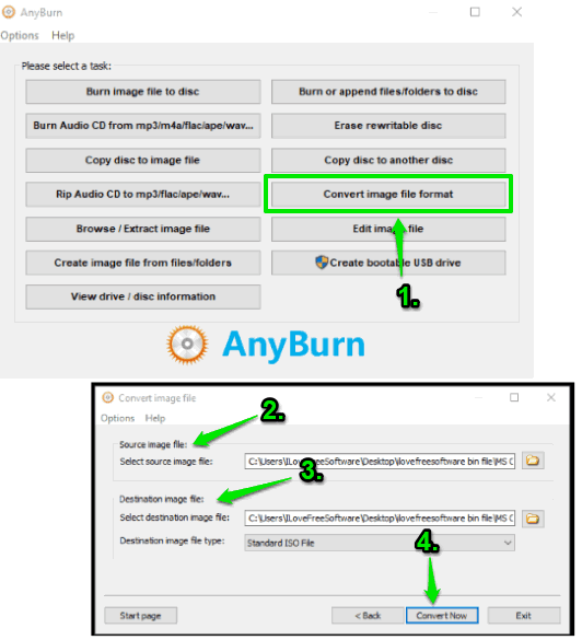 On its interface, you need to select Convert image file format option. It will open “Convert image file” window. Using that window, you can select source image file which will be BIN file, destination image file location and name, and then select Convert Now button. This will begin BIN to ISO disk image format conversion process. The speed of conversion process is quite good and it will take 2 to 3 minutes to convert 3 GB BIN image to ISO image. If you need a multipurpose software that can also convert BIN to ISO file, then this software is all you need.