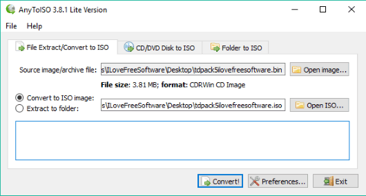 Its interface is simple that provides three different features. You can use it to extract or convert BIN to ISO, CD/DVD to ISO, and a folder to ISO. Use the first tab available on its interface that helps to convert BIN image to ISO image format. You can add source BIN file, set the output folder for ISO file, and then begin the conversion using C0nvert! button.