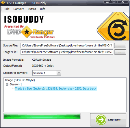 ISO Buddy is another great software for converting BIN to ISO image files. This software is as good as WinBin2Iso (mentioned above). It also supports large BIN files for conversion and speed is also good. Its interface is also very easy to use. You can add BIN file, target ISO file location, and then hit the Start now! button for conversion.