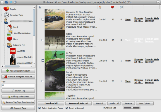 Photo and Video Downloader for Instagram is one of the best Instagram client for Windows 10 in this entire list. Although its main purpose is to download Instagram photos and videos, but you can also use it to check your Instagram feed, add and access Favorite Tags, view your likes, and popular pics. Apart from this, it also shows the list of your followers and following. You can also select a particular person from that list to explore his/her Instagram pics. After exploring the pics, you can download selected or all photos.