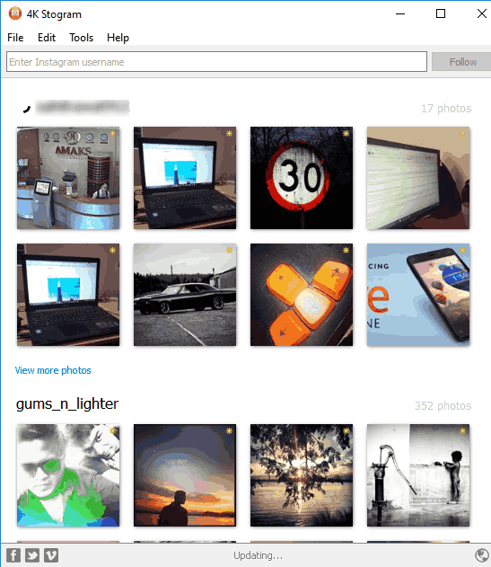 Another useful Instagram desktop client for Windows 10 is 4K Stogram. This free version lets you explore Instagram photos of maximum two users simultaneously. You can remove users from its interface to search and explore pics of more users (one by one).