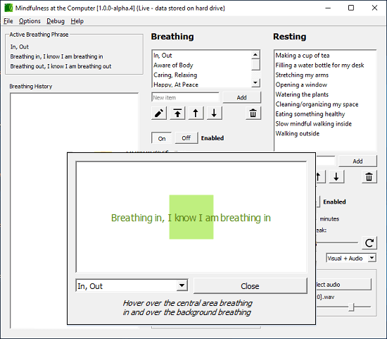 Mindfulness at the Computer is another free software that you can use on your PC as a meditation tool. However, it works in a different way. This software actually falls in the category of break reminder software. It keeps reminding to take deep breaths after a fixed interval of time. It creates an animated box on which if you hover, it will imitate the breathing-in and breathing-out process. This way, you can meditate yourself by taking deep breaths time to time. The software runs automatically. You just have to specify the time interval in it and it will keep reminding you to take breaths through a notification box.