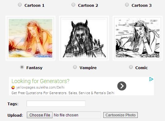 Kuso cartoon is the first online cartoon generator in this list. You can use this website to use different cartoon effects available on the website. There are six different types of effects that include fantasy, vampire, comic, and more. The procedure to cartoonize your photos is also very simple. You simply have to upload your photo, select the effect, and hit the catoonize button. Your photo will be generated in seconds and you can download it back on to your system. The website supports JPG, and PNG file formats.