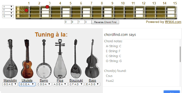And instead, you would need to enter the string numbers in 4 small boxes visible at the bottom of the fret diagram. After that, press the “Reverse Chord Find” button and then it will open a popup dialog with the chord details. You can see the selected notes and the associated chord or chords name.