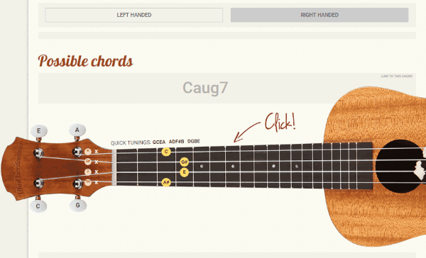 You can also choose between left-hand and right-hand Ukulele and even keep open any string you want. When you’re done with that, go ahead and enter the notes by pressing the Ukulele strings on any fret you want. As soon as you do that, it will automatically find and show you the chord (or chords in many cases) at the top.