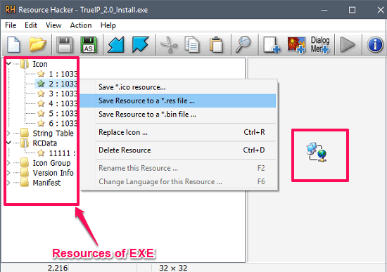 Getting started with Resource Hacker is pretty easy. Import your EXE file in it using the Open option in the file menu. After importing your file, it will organize its components in the left pane in the form of a tree. The nodes of the tree denote various types of resources in your EXE files, such as Icons, Manifest, String table, Version info, RCData, and some others. You can expand any tree node and view the respective data. And if you want to save or extract any resource from it, then right click on it and then choose save resource options. Do note that there are 3 options to save the resource of EXE file in a RES or Bin file. After that, do whatever you want.
