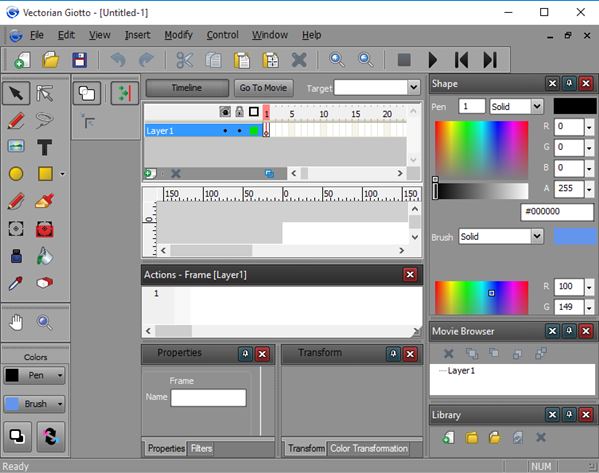 Vectorian Giotto is a very advanced SWF animation creator software for Windows 10. It has a lot of similarities with the actual tools for creating SWF animations from Adobe. Those who have used Flash Professional will notice these similarities. Toolbox from the left sidebar has things like pencil tool, shapes, paint bucket, text boxes, etc.