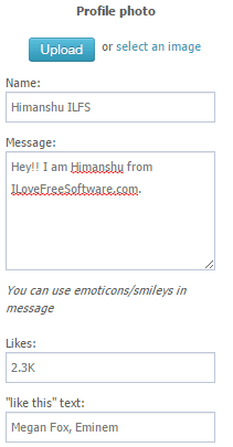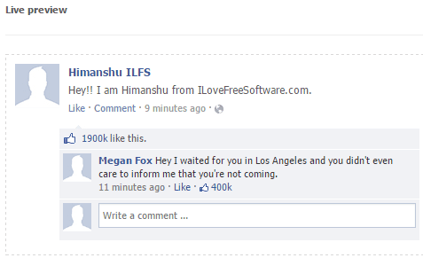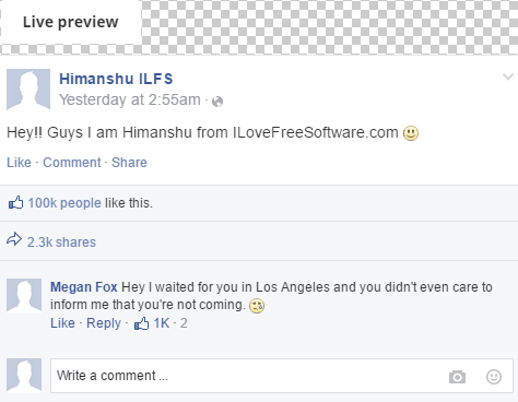 Galau.me is a free website to create fake Facebook posts. You can use it to perfectly simulate Facebook posts, as shown in the screenshot above. It offers a very easy to use interface to generate fake Facebook posts. Basically, all you have to do is specify some parameters like your name, status message, etc and it will build the fake Facebook post image for you in real-time. You can even specify the number of fake Facebook likes on your status and add fake Facebook comments to make it look more realistic and prank your friends. You can see the changes made in the real-time and download the generated fake Facebook post as an image at last. It also gives you the option to share it on different social media platforms like Google Plus, Twitter, and Facebook itself. The best part is that you can use it to create fake Facebook posts in different languages. It supports Arabic, English, Greek, Polski, Portuguese, Deutsch, Espanol, Russian, and Turkce. You can also use to create fake Facebook photo posts and fake Facebook chats.