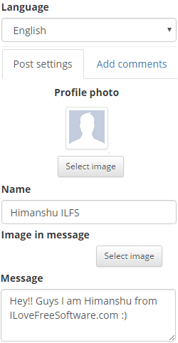 You can get started by specifying the language in which you want to generate the fake Facebook post. After that, upload a profile picture and specify a name of the owner of that Facebook status post. So, if you want to create a fake Facebook post for your friend, then specify his/her name in the Name field. You can also add an image to the status to make it a fake Facebook photo post. Click on the Select image button to upload an image. There are other fields that let you specify total number of fake likes, shares, etc on the post.