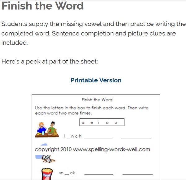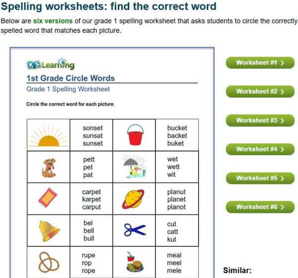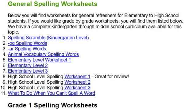 Teachnology is a nice website with lots of spelling worksheets divided grade wise. The worksheets are available from grade Kindergarten to grade 6. When you land on this spelling worksheet page, you will see all the worksheets listed as can be seen in the screenshot above.