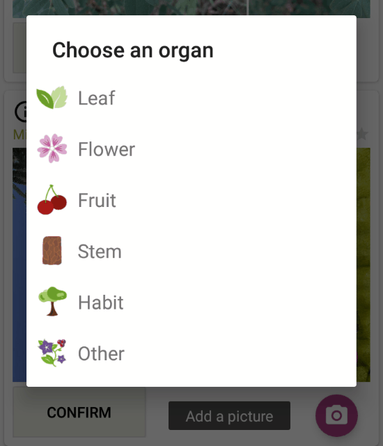 After clicking photo or loading a photo from your phone, this app involves some extra steps. This is the step where you will know how feature rich it is from the above mentioned app. Here, you can click and load almost any part of a plant, including flower, fruit, leaf, steam, etc. After loading photo, you will have to select which part of plant you have loaded to identify plant. It then processes your picture and shows how multiple matching results.