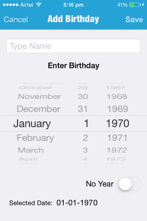 Add Birthday: would let you manually add a birthday by making you choose a date and enter name of the person. A screenshot of this birthday adding process is shown below.