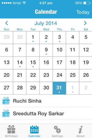 Another view this app provides you is the calendar view. In this view, each birthday is marked on the calendar with a dot. When you click on a particular date, all the birthdays on that date will be listed below the calendar. A screenshot of this calendar view is given below.
