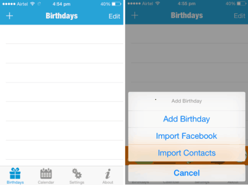 Initially when you launch this app you will see a blank interface like the one shown below in the screenshot on the left. When you click on the plus icon at the top left corner you will get three options to add birthday’s, which can also be seen in the screenshot below on the right.