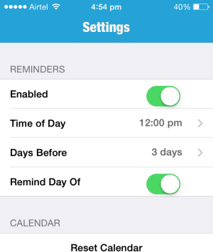 You will get a reminder of the upcoming birthday 3 days prior to the day and one final reminder on the day of the birthday. This setting can be changed by going to the settings icon at the bottom of the page. You can enable or disable the reminders in case you do not want to be disturbed. You can also change the number of days before you want to be reminded, in case you want to shop for a gift. Lastly, you can change the time of the final notification on the day of the birthday, to any time of your convenience. A screenshot of the settings page is given below:
