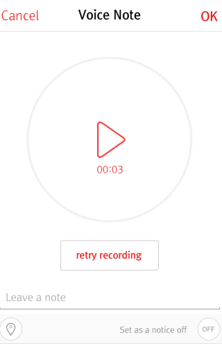 - Voice Note: This feature lets you share voice recordings with the members of groups. To share, tap on the option to get a Red colored circle. Tap on it once to start recording and then again to stop the recording. If you don’t like it then tap on Retry Recording to record it again. When finished, tap on OK to share with group.