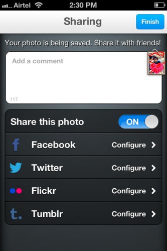 Once you are done with the editing click on the Done button and you will be taken to the sharing page like seen in the screenshot above. Here you will be asked to add a caption or comment on your photo and share it on your social network. The networks you can share this on are Facebook, Twitter, Flickr, Tumblr. You would need to configure your account on each one to activate sharing. Once you do that and click the Finish button your edited photo will be posted on your favorite social networks. The edited photo will be saved in your phone’s camera roll. This sharing on social network is optional. So if you want to share your creations with your friends then you can use this feature.