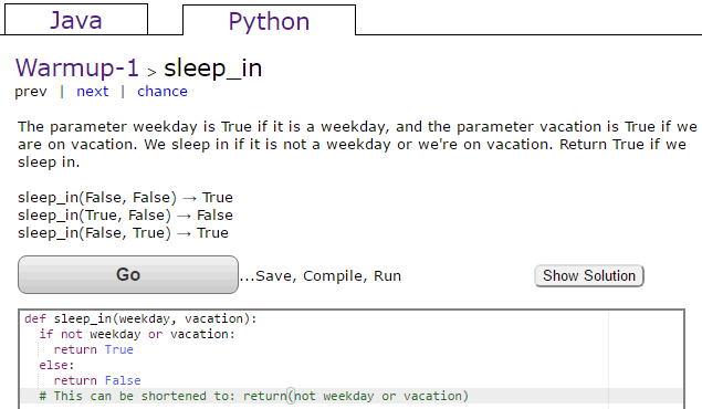 CodingBat is yet another fantastic website to solve problems and practice Python online. In addition to Python, you can also practice Java online on its online IDE. There are also Java and Python tutorials which explain a number of different concepts. Coming back to Python problems, you can write the Python script to solve a particular problem in its online Python compiler, which is shown in the screenshot above. If you are unable to solve a particular problem, then you can also see its complete solution. Once you have written the Python code, compile it to see the results. If your solution is correct, then you will see similar results as shown in the screenshot below.