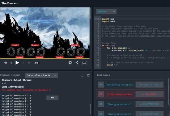 You need to signup on Codingame to play game quizzes and practice Python. After you have logged in, you can begin with a quiz game. The quiz games are displayed on your dashboard; simply select anyone and read its problem statement. After that, proceed to solve it in its IDE which is shown in the screenshot above. You can select Python from the drop-down list of the IDE and then write code in one of your favorite programming languages. In order to solve the puzzle, you need to ensure that your code passes all the test cases.