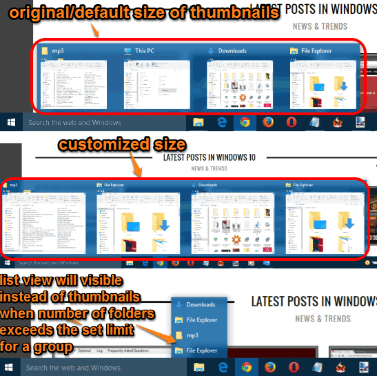 Windows 10 taskbar is powered with a couple of good additions, like the search box, Cortana, Task View, etc. You can also perform few tweaks, such as hide search box and disable saving of taskbar thumbnail preview in Windows 10. However, there is no built-in option to set the size of thumbnails of applications, folders, or disable thumbnails. So those who want to tweak taskbar thumbnails in Windows 10, they can use a very good software, named “Taskbar Thumbnails Tuner“.
