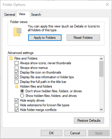 Step 4: In Folder Options, jump to the View tab and click Apply to Folders button. Confirm the action.