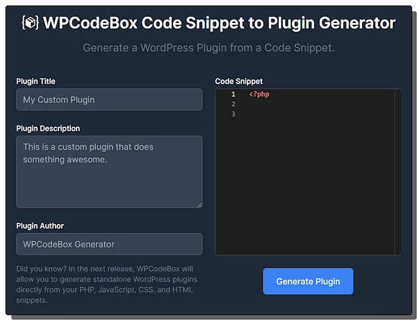 Introducing the “WordPress Plugin Generator”. It is an online tool that allows users to convert code snippets into fully functional WordPress plugins. This tool allows users to generate standalone WordPress plugins directly from PHP, JavaScript, CSS, and HTML snippets. It streamlines the entire process making it as as effortless as copy-pasting and filling out a simple form.