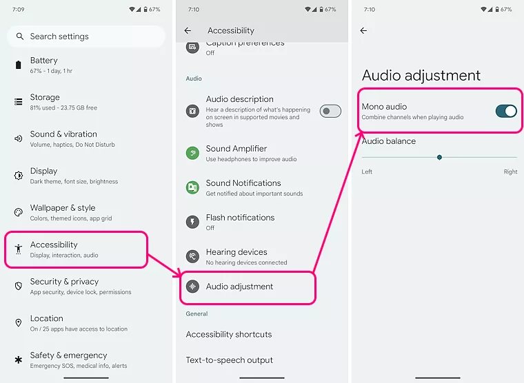 Go to the Settings app on your Pixel Android phone. Scroll down to the Accessibility section and tap on it to open the accessibility settings. Again, scroll down to the Audio adjustment section and tap on it to open. This loads the Mono audio settings. In this section, you can configure the audio balance for the left and right channels. At the top, you get a toggle to enable Mono audio. Enabling this toggle merges both audio channels into a single stream of audio.