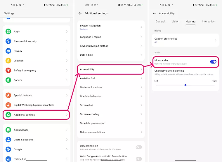 In the case of phones from Realme, OnePlus, Xiaomi, etc., the Accessibility settings are buried under the Additional settings. For that, open the Settings app and look for Additional settings. Tap on it to open. Then select the Accessibility settings from there. In the Accessibility settings, you get sections at the top. Head to the Hearing section and there you can enable the Mono audio.