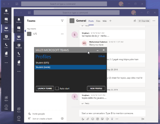 After setting up the first account, go back to the Multi MS Teams tool, and select the ‘New Profile‘ option to create another profile. Pick a name accordingly to keep them easily distinguishable from each other. Then, select the newly added profile and click the ‘Launch Teams‘ option. This opens another instance of the Microsoft Teams app on your screen. This new instance also starts fresh where you can proceed with your other account.