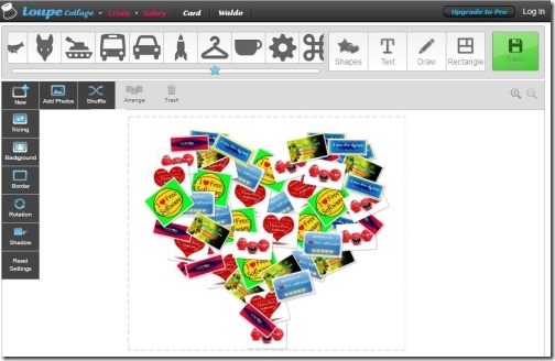 GetLoupe is also a free online collage maker that lets you create photo collage using favorite images. This free online collage making website lets you upload multiple photos at a time, via social networking sites (Facebook, Flickr, Dropbox, etc.), web, or directly from your computer. It lets you create your photo collage in form of shapes, text, rectangles, or a custom drawing. This free online collage maker provide you many tools which you can use for sizing, adding background, adding border, rotating, applying shadow effect, or to shuffle images available in the collage. It also lets you reset settings just by one click.