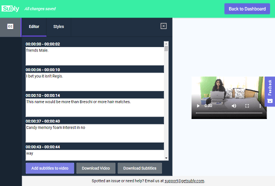 After finalizing the captions, you can either download them separately or embed them into the video from the ‘Editor’ section. With the “Download subtitles” button, you can get a copy of your captions in as a .SRT file. Alternatively, with the “Add subtitles to the video” button, you can embed the captions within the video and download then download the video with embed captions.