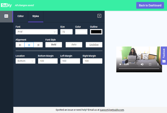 Next to the ‘Editor’, you get a ‘Styles’ section where you can customize the appearance of the captions. You can pick a font face, change font size, color, and outline color. You can change the alignment and font style as well. Apart from that, you can choose a location on the video where you want to show the captions. You can bottom, center, or top and add the margin from the bottom, left, and right.