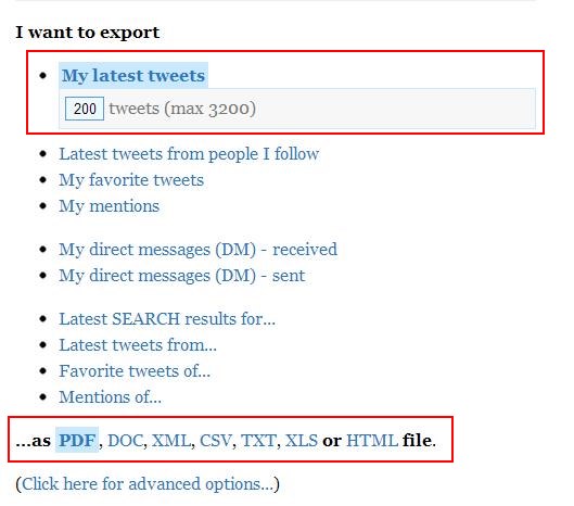twdocs is loaded with options and does everything to make sure that the tweets you love will always be available even if the service discontinues some day. Once you visit the website, you will find all essential functionalities on the homepage itself. This include links to export your latest tweets, your favorite tweets, tweets you follow, your sent or received messages, or any tweet search results from your Twitter account.
