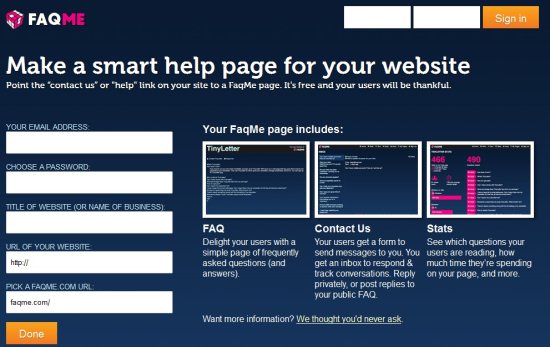 FAQme.com is a free website which lets you create a FAQ page for your website. As we all know FAQ (Frequently Asked Questions) is a question and answer page on a website, which answers the most basic questions a user would have from the website or web service.