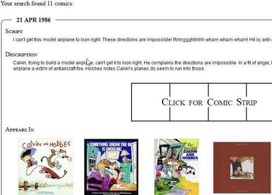 Top of the page will show you total number of results it found related to the keyword. Then it will list the date when that particular comic strip was published. Then you will see script and description of the comic strip. At the bottom it will also show if this strip was part of a comic book. In the center the box you see with the text “click for comic strip” will take you to the strip when clicked.