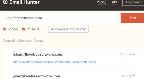 For every email address, it also provides the source page from which it has fetched that particular email address. So it makes it easy for you to grab the email addresses of a particular domain without manually searching for the contact information.