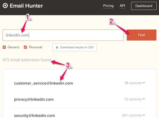 Email Hunter is a free website to find email addresses from different websites to contact people. For example, it can help to fetch email address from a LinkedIn profile, if possible so that you can contact that person. Similarly, you can use it to fetch all the general email addresses related to a particular website. This website is great for digital marketers as they can contact people to increase the sales. More than 150,000,000 records are available in the database of this website.