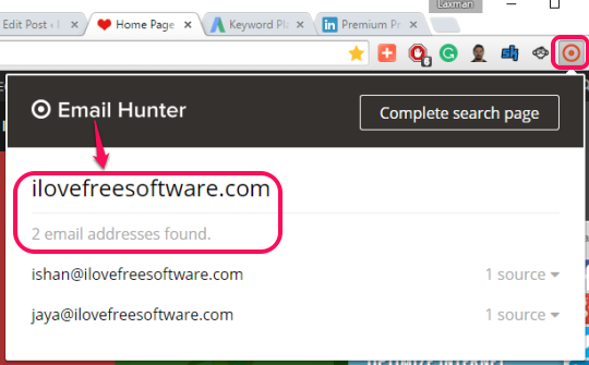 Apart from fetching the email address for a LinkedIn profile, this extension is also handy to grab all the email addresses for a particular domain. For this, you need to use its extension icon (available at top right corner) on your Chrome browser. After clicking that icon, it will start searching for email addresses for the active tab, and show you the list of available email addresses (along with source).