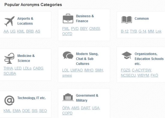 The website features on top of the page the most popular slangs and acronyms being used by people. Apart from this the acronyms have also been categorized into different heading like education & school, government, airport, medicine & science, etc. The various categories can be seen on the screenshot below. You can browse through popular acroymns being used in each category.