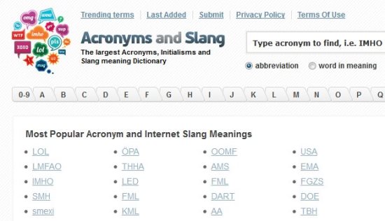I admit that sometimes looking at acronyms on news websites, I wonder what it stands for. I end up looking at another website to find its full form. Doing this regular chore of mine, I came across this nice website called acronyms and slang. The websites has a huge database of acronyms, slangs, initials that you come across or don’t come across while browsing the internet.
